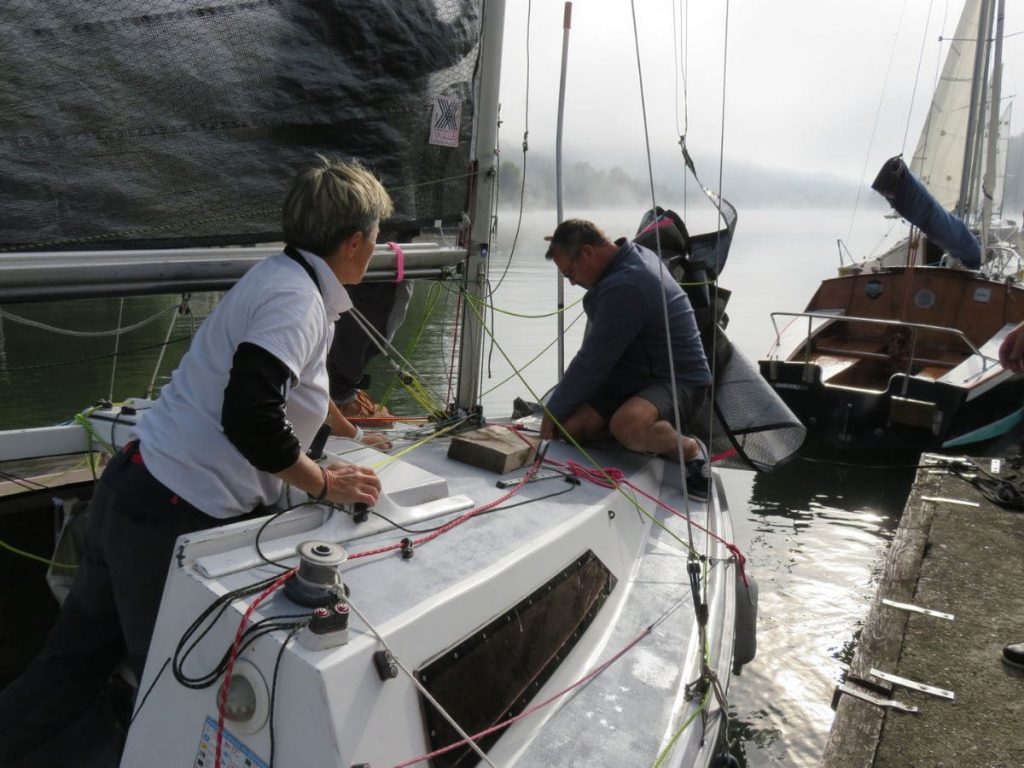 Très vite, les régatiers arrivent et je laisse notre présidente à ses devoirs de Comité de Course. Sur le parking, j’observe la précision avec laquelle le grutage est effectué. En effet, sous la surface, il y a peu de profondeur. Cela est dû à l’obstruction du bras d’eau derrière l’île. Par conséquent, il n’y a plus assez de courant pour éviter l’envasement de la zone. Je poursuis ma route le long du ponton. Ici et là, j’écoute des bribes de conversations et entends des « Bonjour! » lancés à la volée à des amis de longue date. Au loin, les copains de l’AS Mantaise Voile arrivent paisiblement. Ces derniers sont portés par le courant et sortent de la brume fantomatique qui règne encore.