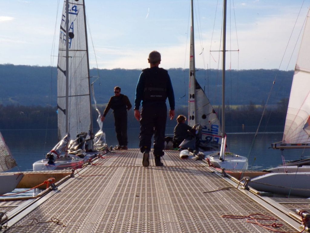 Il est sept heures ce samedi matin, la base nautique dort encore et l’aurore pointe le bout de son nez. Je profite de la quiétude pour prendre un bon petit-déjeuner au self. Il va falloir prendre des forces, car la journée promet d’être longue. Les prévisions météo sont les mêmes que la veille, mais pour le moment, il n’y a pas de vent. Vers neuf heures trente, les pontons s’éveillent, leurs ridules sont les seuls éléments perturbateurs à la surface du lac. Mis devant le fait accompli, le Comité de Course envoie l’aperçu à terre. Le mot d’ordre du jour : patience.