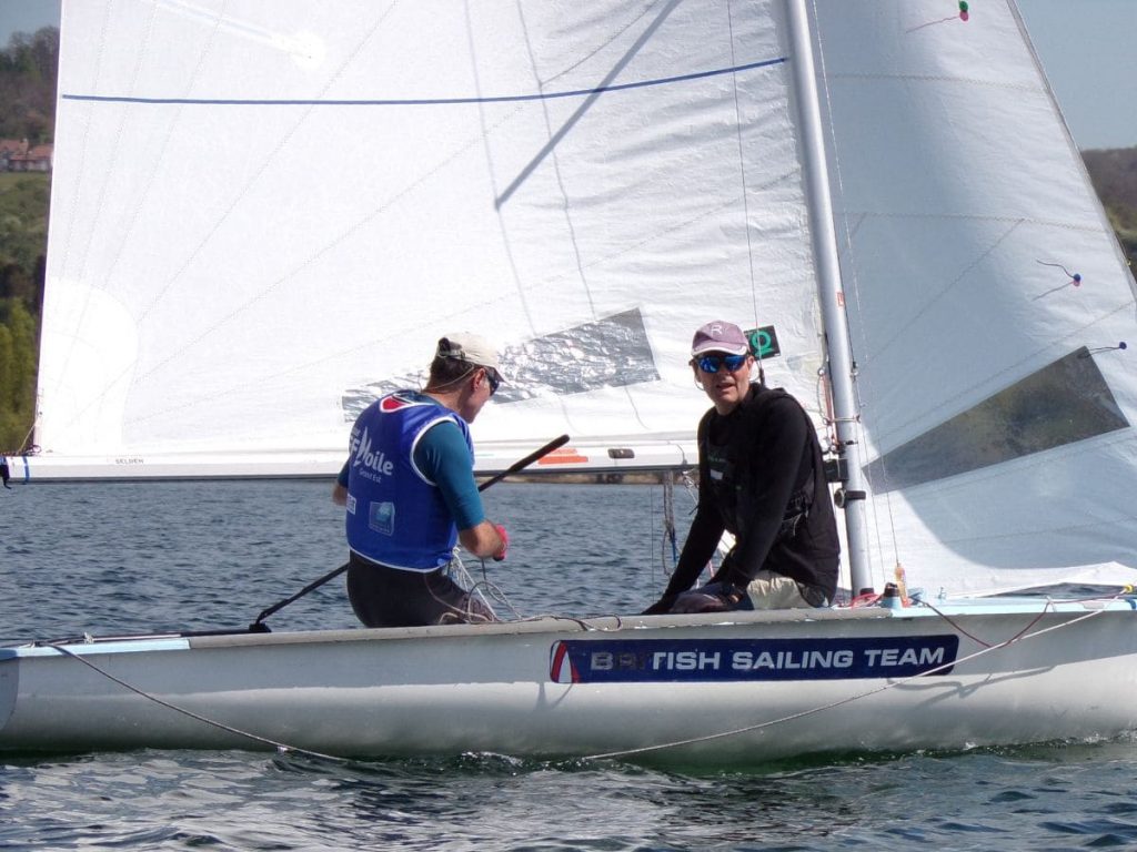 Je prépare mon bateau, foc, tension, spi, grande voile. En bas de la cale, dès que les Weta sont partis, nous ne traînons pas. Florence et moi montons à bord, à peine le temps de border les voiles que je suis déjà plein trapèze. L’hiver n’a pas été riche en navigations, nous sommes un peu rouillées. L’échauffement commence avec une série de virements de bord.